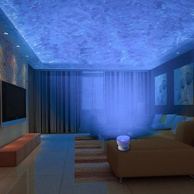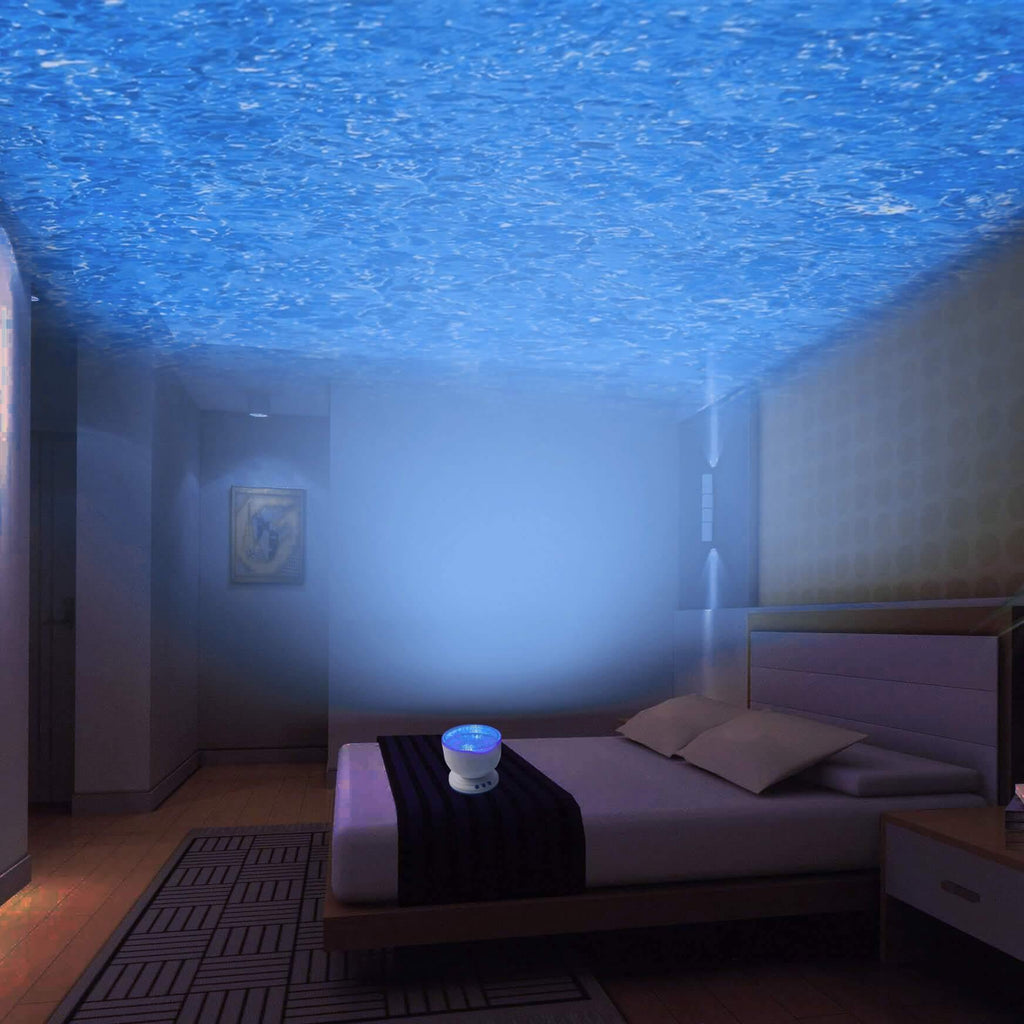 Assista as encantadoras ondas do oceano azul no seu teto e paredes. O Projector de ondas faz você sentir-se relaxado, enquanto também reproduz suas músicas favoritas para uma noite acolhedora!